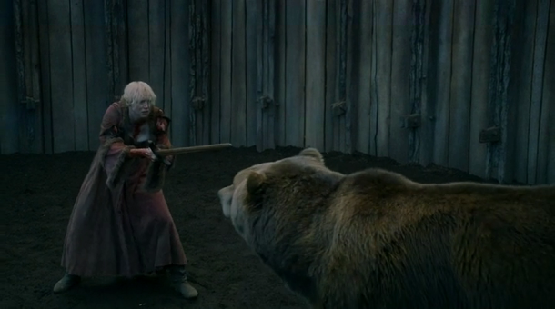 „The Bear, the bear, and the maiden fair…” Titlul m-a dus inițial cu gândul la Jorah și Daenerys, dar aparent în serial lucrurile stau puțin altfel, și ei au preferat să se raporteze la scena dintre Brienne și urs.